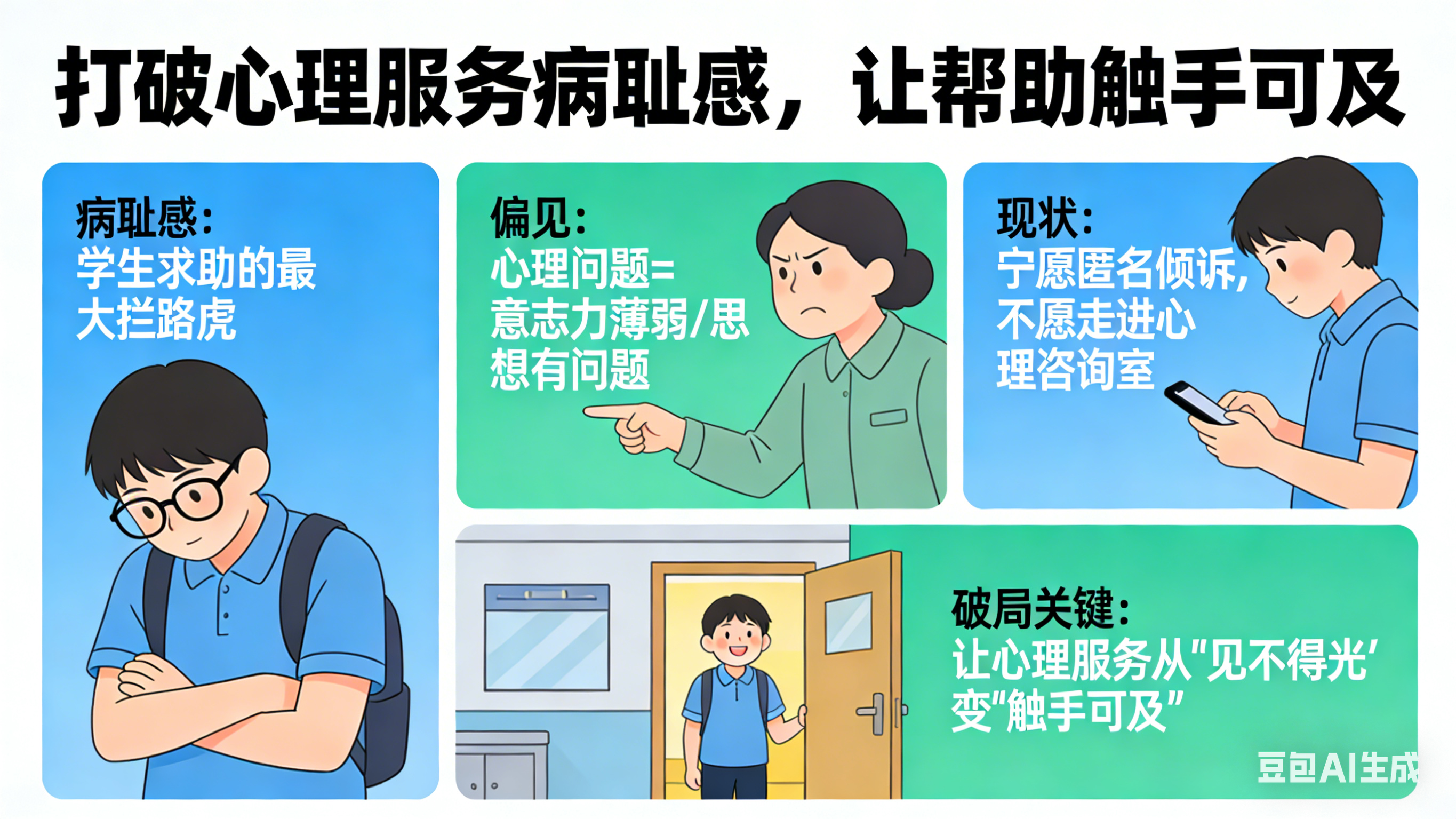许多学生和家长将心理问题等同于“意志力薄弱”、“思想有问题”。这种偏见导致大量学生宁愿独自承受,在网络上匿名倾诉,也不愿走进学校的心理咨询室。如何让心理服务从“见不得光”变得“触手可及”,是破局关键。