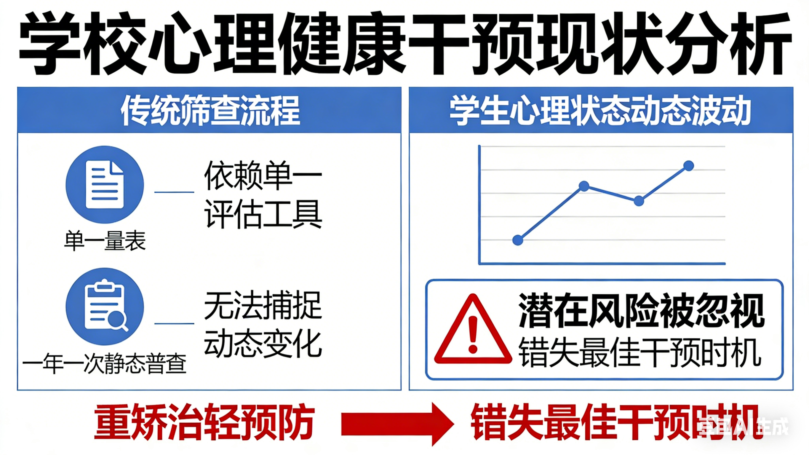 传统筛查依赖单一量表、一年一次的静态普查,难以捕捉学生心理状态的动态波动,导致大量潜在风险被忽视,错失最佳干预时机。